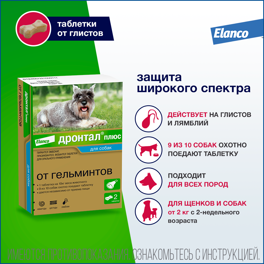Дронтал®плюс, таблетки от глистов и простейших для собак, – препарат от компании Elanco, помогающий избавить вашего питомца от самых распространенных внутренних паразитов – круглых и ленточных гельминтов, а также от простейших – лямблий.